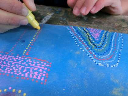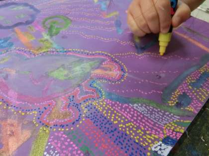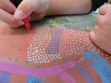3年生は、オーストラリアの先住民・アボリジニのドットアートに挑戦しました。読む,書くといった文字を持たないアボリジニの人びと。砂漠で生きぬく知恵や神話を絵に描くことは,彼らにとってとても大切なことで、私たちが描く絵とは内容も目的も大きく違うということをまず学習してから、制作に取りかかりました。