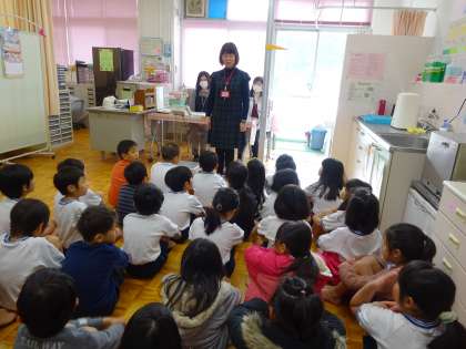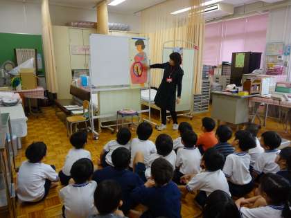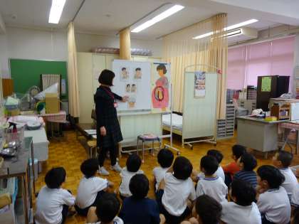「お風呂に入る時に、ちゃんとおへそも洗っていますか。」「お母さんから産まれた大切なしるしのおへそも大切にしようね。」というお話を、みんな真剣に聞いていました。