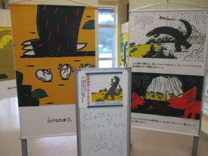 本日より1月30日まで、世田谷文学館よりお借りした「宮西達也と子どもたち」というバナー展示会を第3昇降口で行っています。「おまえうまそうだな」など、子どもたちに人気のある絵本作家のバナーや関連図書を展示しています。早速、絵本を手に取って読んでいる子どもがたくさんいました。