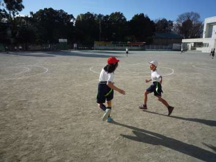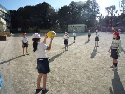校庭では、友達のタグをとる「タグとり鬼ごっこ」と、ラグビーボールのパス練習やボールとりゲームを行いました。