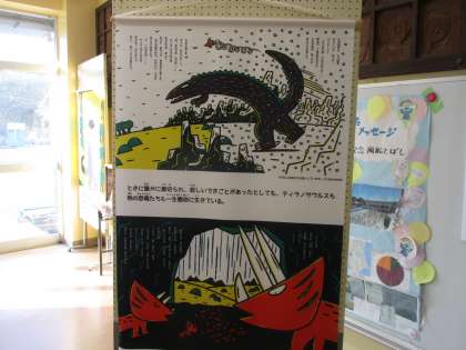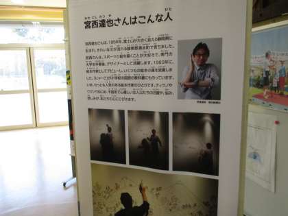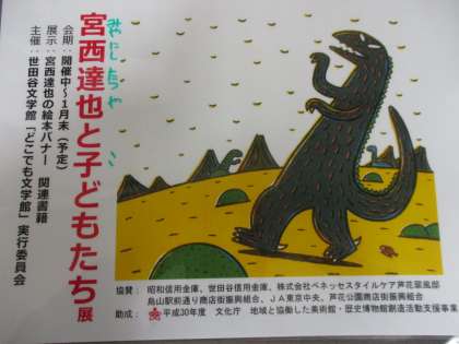 現在、第3昇降口で、世田谷文学館主催の「宮西達也と子どもたち 展」を行っています。子どもたちに人気のある絵本作家の絵本バナー展ということで、廊下を通りながら絵を見たり、同時に置いてある宮西達也さんの絵本を読んだりする姿が見られます。今月、30日まで展示をしているので見に来てください。
