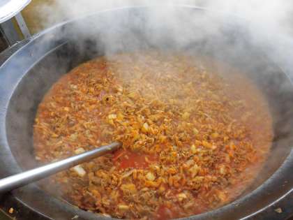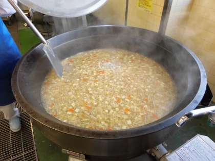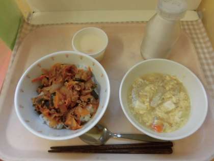 ☆今日は『キムチ丼』です。今日も給食室の大釜でたくさん作りました。子ども達に食べやすいように辛さを調整しています。ごはんがすすむ1品です。