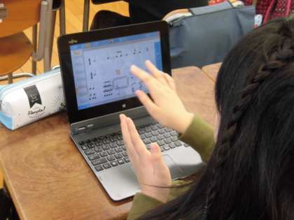 3つの音を組み合わせておはやしの音楽を作るために、タブレット型端末を使ってふしづくりをしたり、そこに音を付けて簡単な旋律をつくったりする活動でした。子どもたちはみな、意欲的に取り組んでいました。