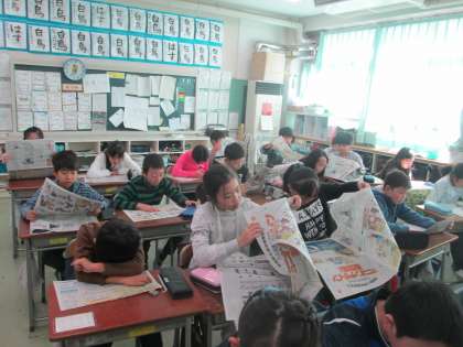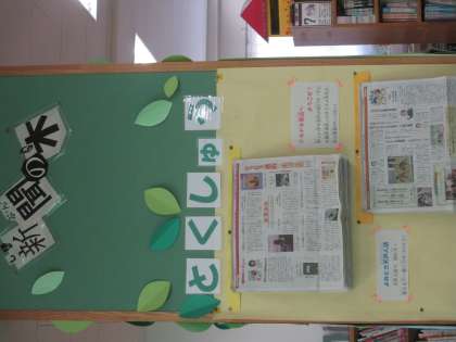 23日、図書館では1年生、つくし学級の子どもたちが学習を行い、図書の本の返却・貸し出し、司書による読み聞かせが行われました。また本日は新聞社より、3〜6年生に子ども新聞が届けられました。烏山小図書館には、「新聞の木」のコーナーが設置されています。これを機会に新聞に興味をもって、読みに来る人が増えることを期待します。