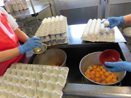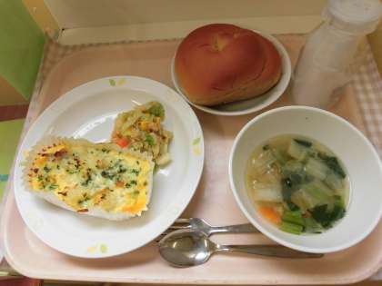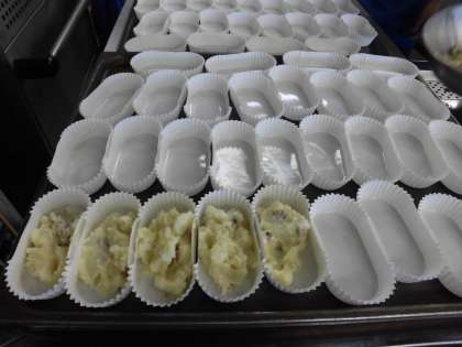 ☆今日は新メニューの『フレンチエッグ』です。給食室では、朝から沢山のじゃがいもの皮をむき、蒸してつぶしました。つぶした じゃがいもを1つ1つカップに入れて卵の液卵とチーズをかけてオーブンで焼きました。とても時間のかかるメニューです。