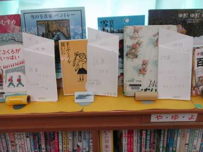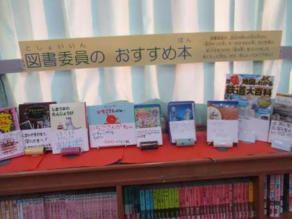 本日30日の中休みは、縄跳びの練習がなかったので、多くの来館者がありました。それぞれ好きな本を選び、静かに読んでいました。今、図書館には、図書委員会の人たちによる本の紹介コーナーができています。本の帯を作って展示したり、読書クイズを作ったカードを本の近くに置いたりして、おすすめの本の紹介をしています。