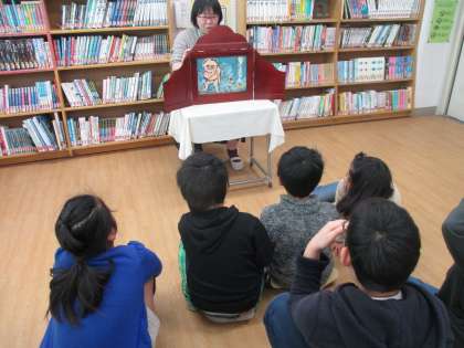 また、授業で来たつくし学級の子どもたちには、司書さんが紙芝居を見せていました。節分に因んだ鬼のお話で、よく見ていました。