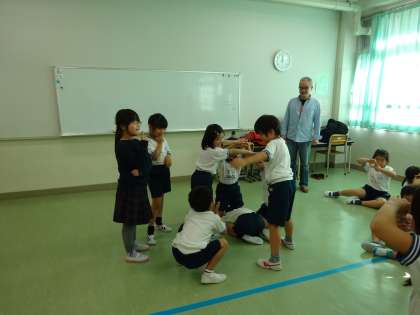 前回の復習で、「だるまさんがころんだ」風の表現遊びをしたり、絵本「ぶたのたね」の一場面をグループで協力して表現したりと、頭と心と体を使って楽しい2時間を過ごすことができました。