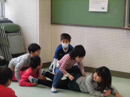 絵本「ももたろう」を読み聞かせしていただいた後、「ももたろう」の場面をいくつかに分けて、友達と協力をしてその場面を再現するという活動をしました。