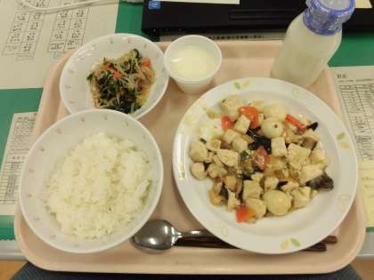 ☆今日はたくさんの具材が入っている『豆腐の五目炒め』です。栄養バランスがとても良い1品です。そして給食室手作りの特製ミルクゼリーもついています。