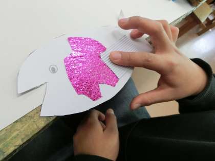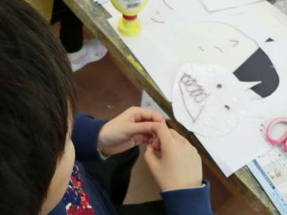 3年生は、紙版画の作品づくりが始まりました。でこぼこ、がたがた、ぶつぶつなど、いろいろな素材の触り心地を手で確かめながら、「これは、うさぎさんの耳に使えるかな?」「この紙は、海底の岩みたいな感じだね!」と話しながら、はさみで素材を切って、貼り合わせていました。テーマは【大好きな○○!!】です。