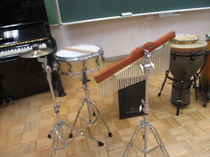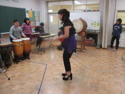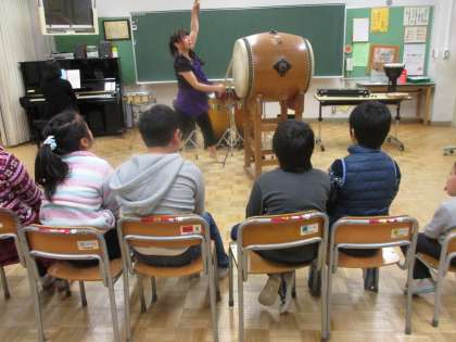 本日9日は、打楽器奏者の村上響子先生がいらしてくださり、パーカッションコンサートが開かれました。スネアドラム、ボンゴ、コンガ、など多数の打楽器を持ってきてくださり、子どもたちの知っている曲をピアノの合わせて演奏して聞かせてくださいました。参観にいらした保護者の方々も子どもたちと一緒に迫力ある演奏に聞き入っていました。最後に子どもたちも気に入った楽器を鳴らさせていただき、満足そうでした。