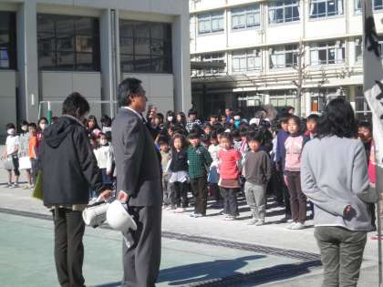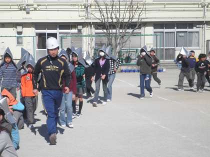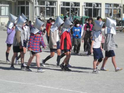 今日の設定は、放送機械が使えず、主事さんたちが、大きな声で知らせて避難する