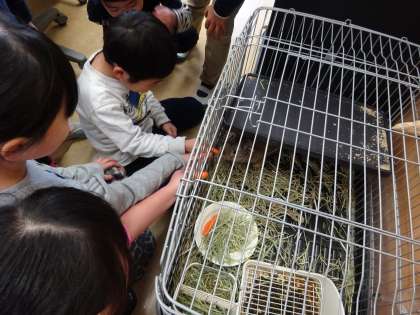 今日は、2組の児童がえさやりをしました。「にんじんよりも、草の方がすきみたい。」「あ、なめたよ。」と、楽しそうにふれあいました。