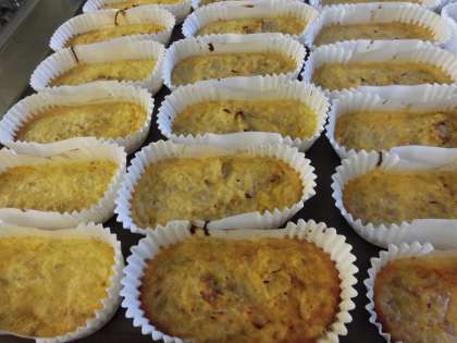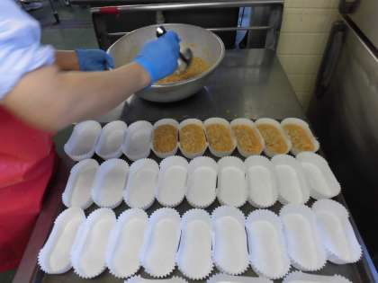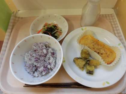☆今日の献立は『切干大根の卵焼き』です。卵焼きの中には切干だいこん 豚挽き肉 にんじん たまねぎが入っています。給食室で1つ1つカップに入れてオーブンで焼きました。