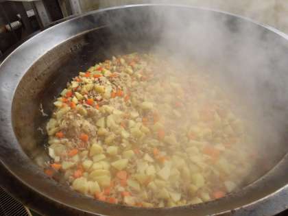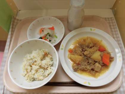 ☆今日の給食は『肉じゃがうま煮』です。肉じゃがうま煮には、「豚肉 にんじん 高野豆腐 じゃがいも 玉葱 しらたき」と具だくさんな煮物になっています。調理員の方が子ども達に美味しく食べてもらえるように包丁で沢山の野菜を切ってくれています。今日も給食室の大釜で沢山作りました。
