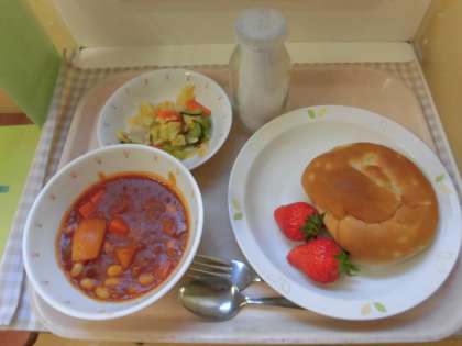 ☆今日の献立は『トマトビーンズシチュー』です。トマトビーンズシチューは、大豆と豚肉をトマト味で煮込みました。大豆も入っているので栄養満点です。