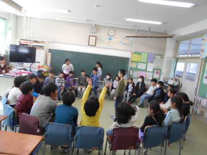 本年度最後のたてわりはん遊びが昼休みに行われました。今回は、来年度にむけて、5年生が中心となって遊びを考えて活動しました。各班とも、ばくだんゲームやいすとりゲームなどで楽しく遊び、盛り上がっていました。6年生もゲームにたくさん参加し、最後のたてわりはん遊びを楽しみました。活動のふりかえりでは、6年生が5年生にむけてエールを送っていた班もありました。