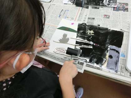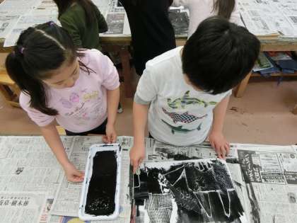 お友達とペアを組んで、和紙を押さえたり、ローラーでインクをつけたり、手際よく作業を進めて、素敵な版画作品を完成させることができました。協力をしてサポートしあう姿に成長を感じました。