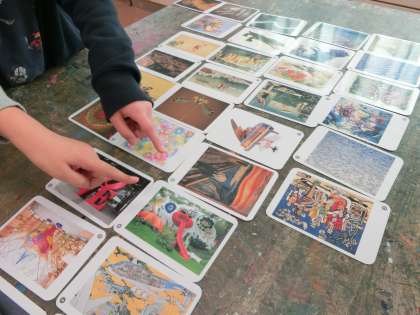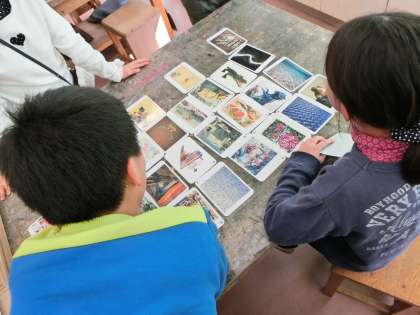 それぞれのカードに描かれた作品をじっくり鑑賞し、自分の手持ちのカードとの共通点を見つけて友達に発表しました。ゲームの途中、同じ班のお友達から違う意見が出たり、