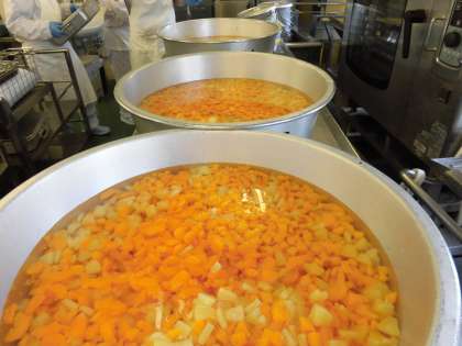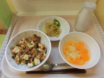☆今日の献立は『麻婆豆腐丼』です。たくさんの具材を使用していて、にんじん たけのこ しいたけ にんにく しょうが ぶたにく ねぎ たけのこ とうふ にら 大豆が入っています。特に大豆は食べやすいように粉さいして入れました。そして、子ども達に人気のフルーツポンチもたくさん作り食べていただきました。