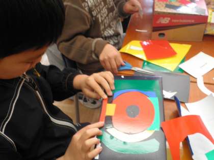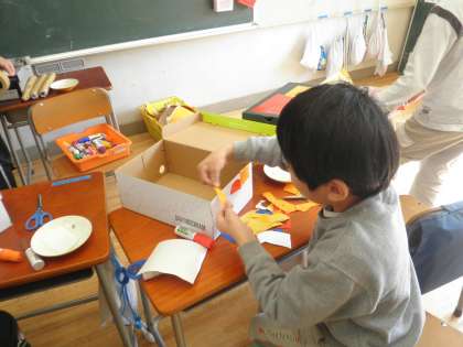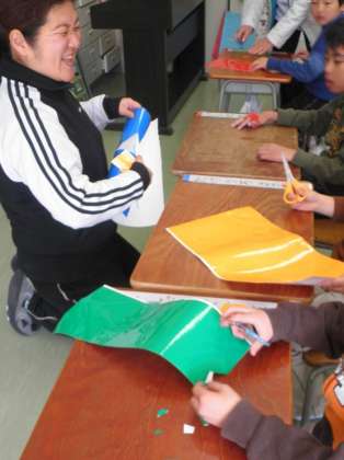 太鼓を飾るためにいろいろな色の紙を貼っていました。