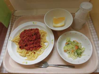 ☆今日の献立は子ども達の好きな『スパゲティーミートソース』です。ミートソースも給食室で作られています。約100個の玉葱 大豆 にんじん ピーマンを調理員さんの皆さんがみじん切りにして、じっくり煮込み作られたソースです。スパゲティーに沢山のミートソースをかけていただきました。果物は河内晩柑(かわちばんかん)と言ってグレープフルーツのような酸味がある果物です。