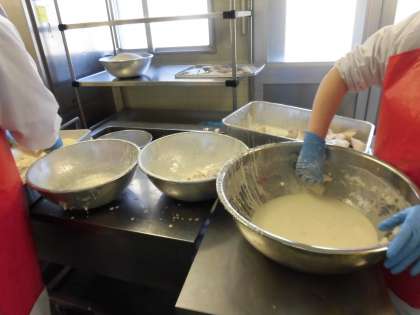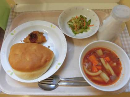 ☆今日は給食室で、メルルーサに小麦粉とパン粉をつけて給食室で丁寧に1つ1つ揚げました。パンは柏型なので自分でフライを挟んで「フライサンド」にして食べていた子ども達もいました。サラダには今が旬の春野菜(アスパラ 春きゃべつ)を取り入れています。