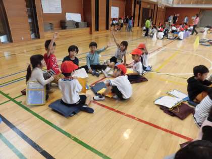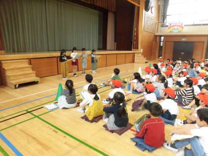 体育館に入ってきた1年生を自分たちの班に並べることや、はじめの会・おわりの会の司会も2年生が行いました。1つお兄さん・お姉さんになった2年生の頼もしい姿が見られました。学校には1年生の知らない教室がたくさんあります。広い校舎の探検で迷子にならないよう、1年生としっかり手をつないで楽しく探検できるとよいです。