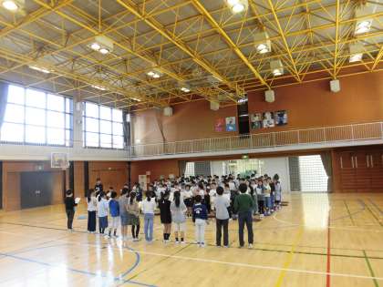 この日の4校時に、5年生が体育館で1年生を迎える会の練習をしました。
