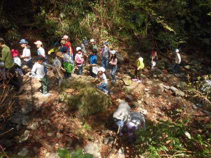 4年生は3年生を引っ張って、励まし合いながら山登りを楽しんでいました。頂上では班の仲間とお弁当を食べました。