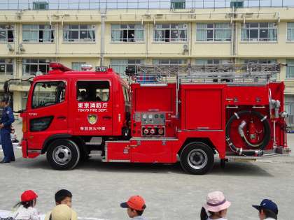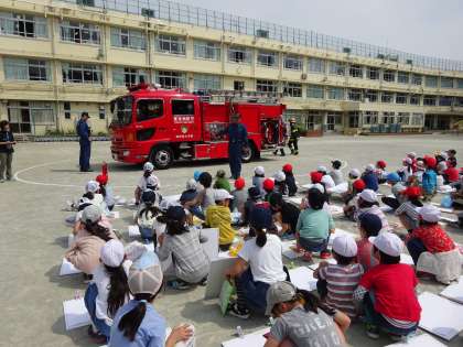 2〜4時間目に、2年生とつくし学級の児童が働く消防写生会を行いました。校庭に大きな消防車が実際にやってきて、目の前でじっくりと見ながら、絵を描くことができました。消防士さんの制服もとてもかっこよくて、みんな興味津々でした。