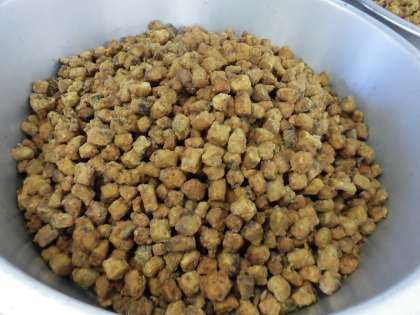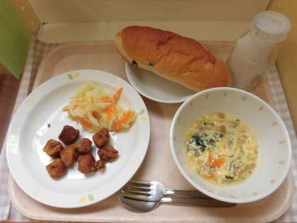 ☆今日の給食は『かつおのかりんと揚げ』です。かつおにしょうゆ みりんと下味を付けて片栗粉をまぶして給食室の大釜で揚げました。かつおは蛋白質や鉄分が豊富で栄養満点です。今後も子ども達が食べやすいようにかつおを取り入れた料理にチャレンジしていきたいと思います。