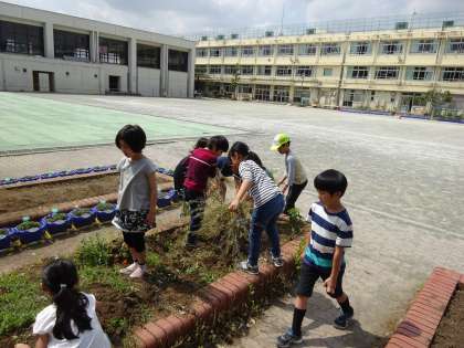 そこで今日、2組と3組が畑の雑草取りをしました。大きな袋5つ分の雑草を楽しみながら引っこ抜く2年生。