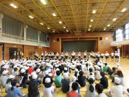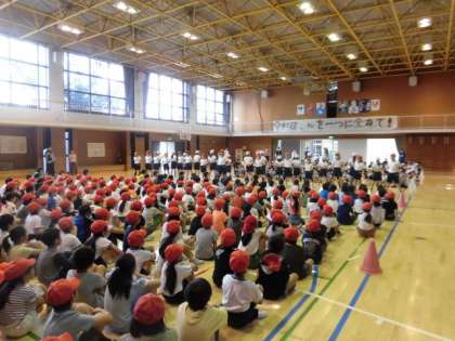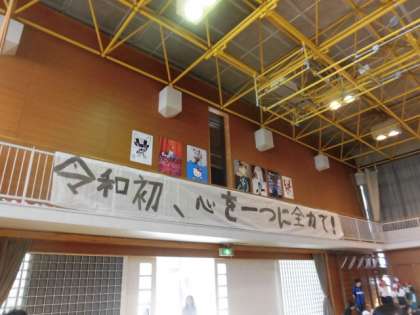 運動会を間近に控え、代表委員会が作成した運動会のスローガンの発表、応援団による応援合戦の練習などがありました。