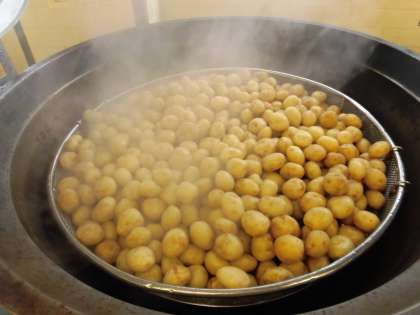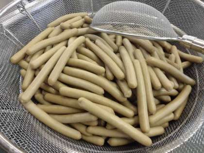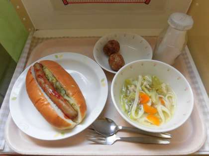 ☆今日は『新じゃがのフライです』新しゃがは、皮が薄く柔らかいので、剥かずに調理出来るのが特徴です。給食室では、じゃがいもを洗い1度蒸してから皮付きのまま揚げました。そして子どもたちには、コッペパンにウィンナーを挟んで食べていただきました。
