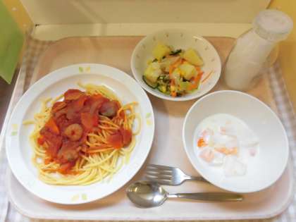 ☆今日は『スパゲティー地中海ソースです』いか えび あさりをたくさん使用して、ソースを作りました。子ども達が好きなケチャップ味で暑い日でも食欲が増す1品です。