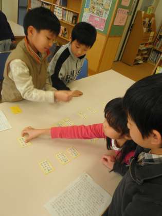 2年生は、新しく購入した五色百人一首をしていました。五色百人一首は、百人一首を5つの色に分けて、20枚ずつでゲームができます。