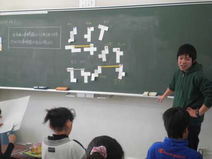 4年生は、算数で立方体の展解図を考えていました。みんないろいろと進んで考えていました。