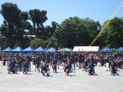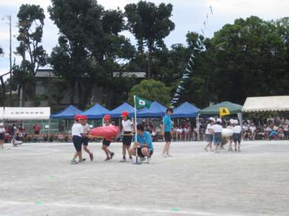 4年生は、「エイサー」、「ジャンボリレー」、80m走を行いました。エイサーをかっこよく踊り、ジャンボ餃子を協力して運びました。