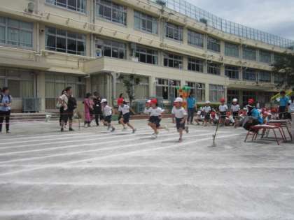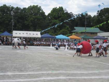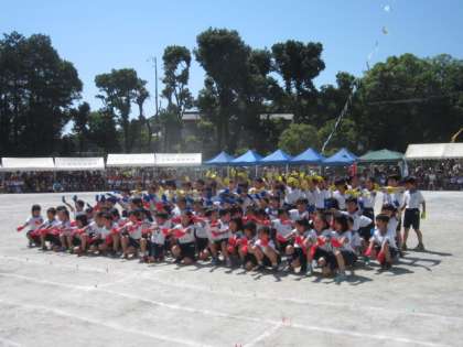 2年生は、「GOOD★LUCKY」、「はこべ ぼくら元気玉!!」、「50m走」を行いました。グッド・ラッキーは笑顔で踊り、元気玉を4人で協力して運びました。、