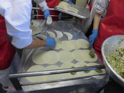 ☆今日の給食は、子ども達が楽しみにしていた『ジャンボぎょうざ』です。給食室では大きなぎょうざの皮を使い1つ1つ丁寧に包みました。ご自宅では、なかなか出来ないジャンボぎょうざの完成です。
