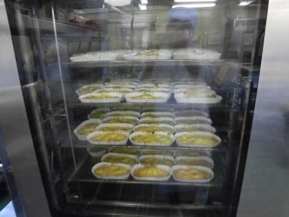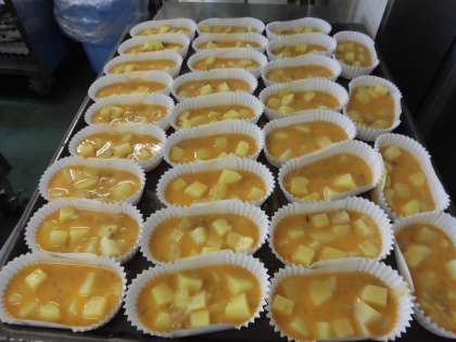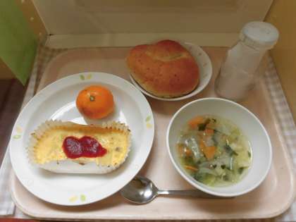 ☆今日の給食は『スペイン風オムレツ』です。スペインで作られた卵料理ですが、オムレツにじゃがいもや玉葱が入っています。給食室のオーブンでこんがり焼いて、トマトソースをかけていただました。