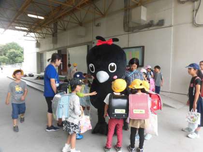 今週は上祖師谷中学校と合同のあいさつ週間です。からぴょんも来てくれていっしょにあいさつをしました。