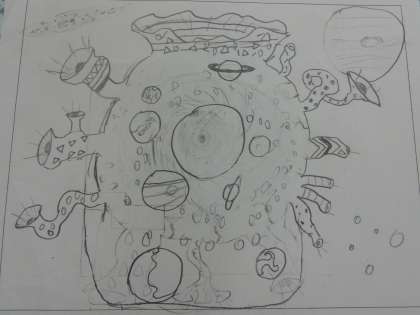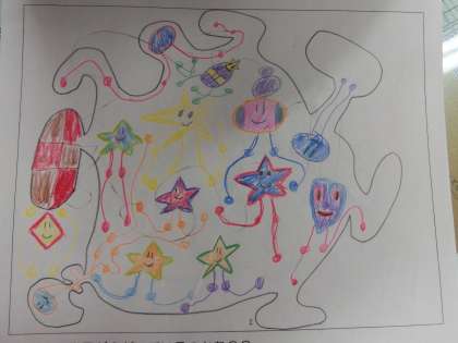 4年生は、不思議な形をした<まほうのつぼ>をデザインしました。子ども達は、「つぼの中をのぞくと、夢の世界が広がっているんだよ!」と笑顔でワークシートを見せてくれました。