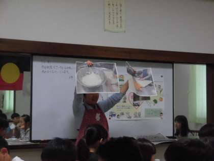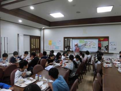 いつもの教室とは違う場所で、栄養士の金子さんから「感謝して残さず食べよう」のめあてとお話をいただき、特別デザートを食べながら充実した時間を過ごしました。