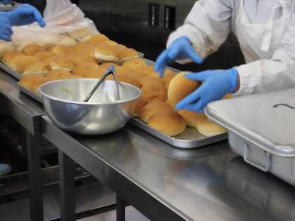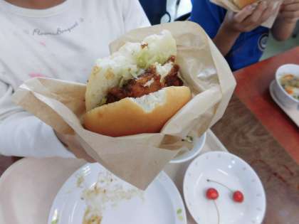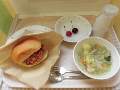 ☆今日の給食は「セルフチキンカツサンド」です。鶏肉に小麦粉とパン粉をつけて1つ1つ丁寧に揚げました。子ども達には丸パンにチキンカツを挟んで、バーガー袋に入れて食べていただきました。そして、さくらんぼは、山形県から取り寄せています。