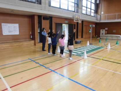 横断歩道のわたり方、歩道の歩き方についてお話を聞き、体育館に作られた道を歩いてみました。