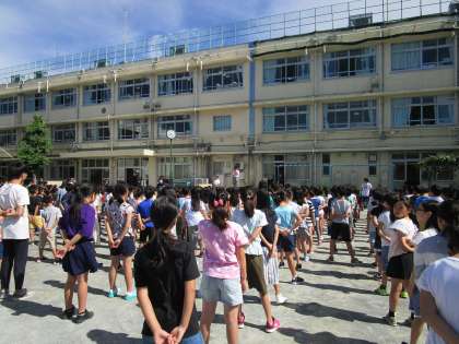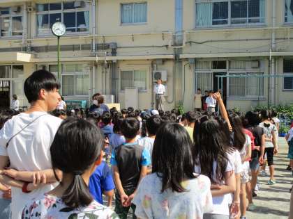 今日の全校朝会は気持ちのよい青空の下、児童がびしっとそろって始めることができました。