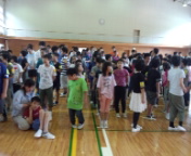 13時30分、15校の子どもたち135人、引率者77人、計217人が全員が集まって、河口湖移動教室開室式を行いました。3日間、他の学校の子どもたち仲良しになるようあいさつをがんばります。